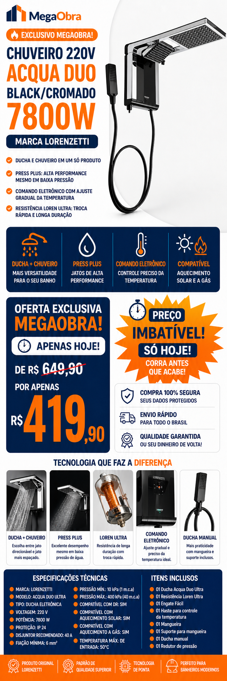Antes da compra, vi muitas mensagens positivas e negativas sobre o produto, mesmo na incerteza resolvi comprar, e minha experiência foi a seguinte, moro em uma região muito fria, após a montagem seguindo todos as etapas do manual, com o registro todo aberto e a potência no maximo, achei que o chuveiro não aquecia o suficiente para a sua potência (7800w), mas antes de sair criticando o produto, resolvi fazer alguns testes para tentar identificar o de estava o problema, e acabei descobrindo que tenho um problema a rede elétrica (220v) que alimenta a residência, quando liga o chuveiro na potência maxima a tesão está caindo para 200v, fazendo com que a potência do chuveiro seja reduzida, sendo assim preciso fechar um pouco o registro para reduzir o volume de água para que o chuveiro aqueça o suficiente para se tomar um banho em um dia frio (temperaturas ambiente medias de 10°c +/-). A primeiro momento irei solicitar a concessionária da minha região para que solucione o problema da rede elétrica. Recomendo o chuveiro? a resposta é sim, mesmo com essa limitação da rede elétrica o produto está excelente até o presente momento, sobre a pressão de água, recomendo atentar-se nos requisitos mínimos de 1 mca.