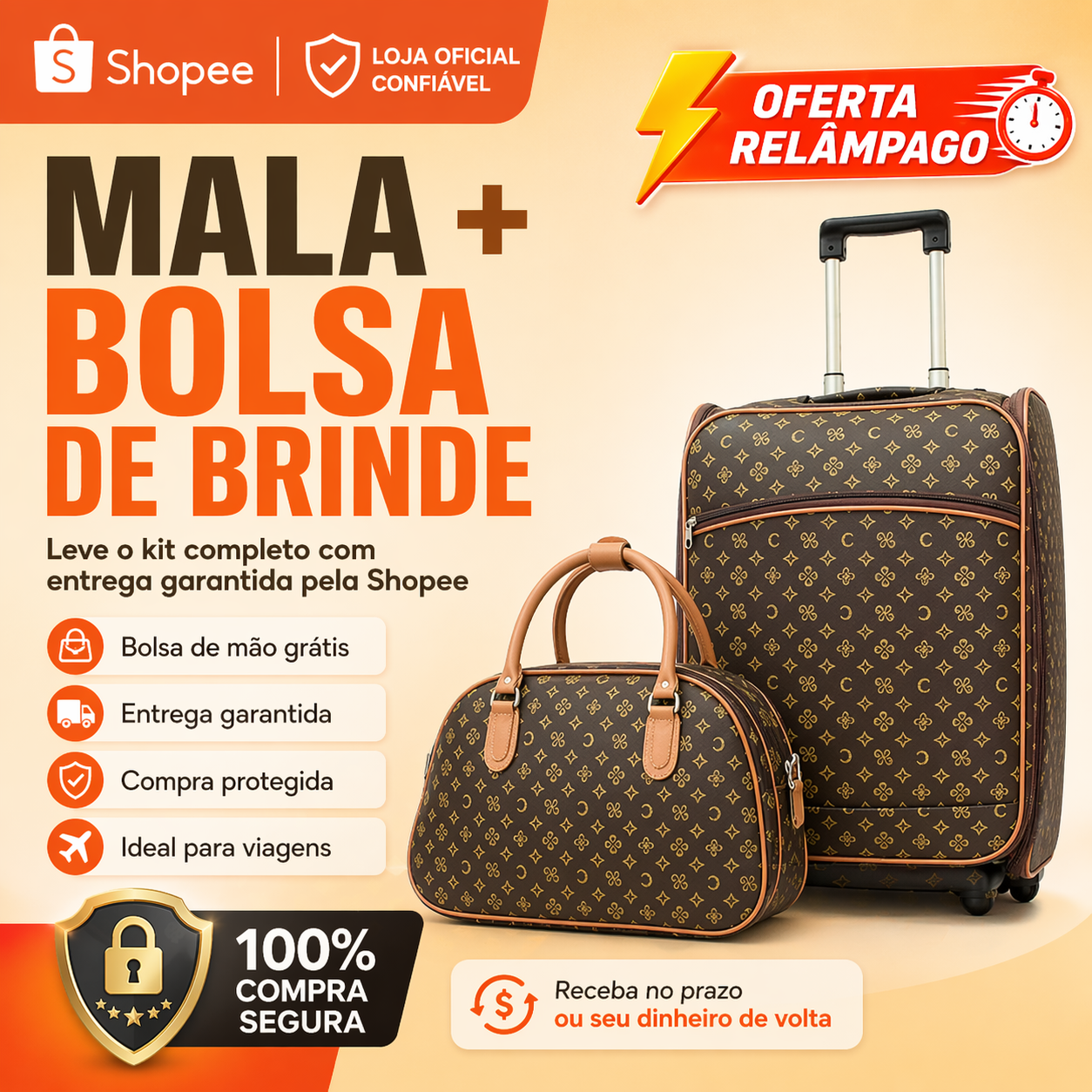 - 1 Mala Quadrada de Bordo com Rodinhas.