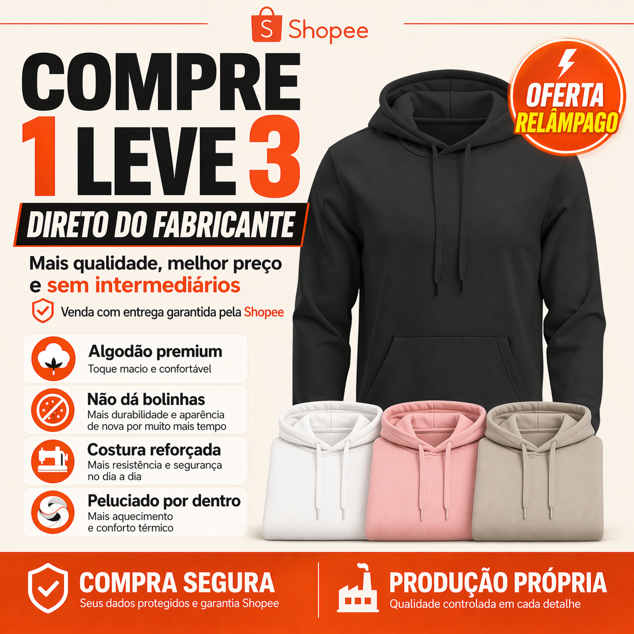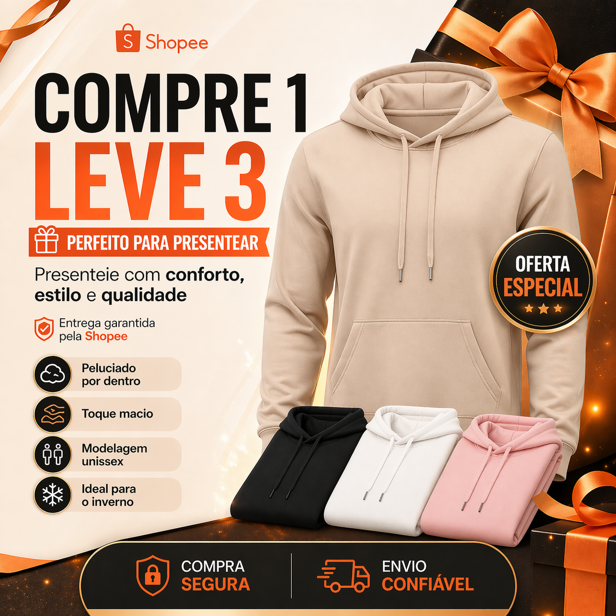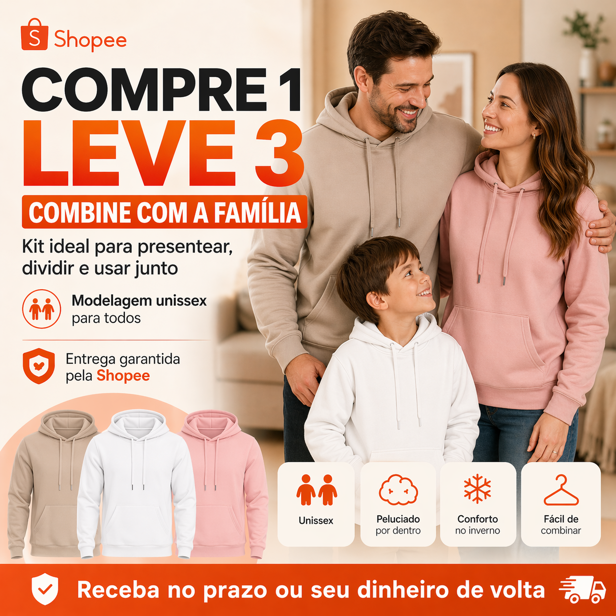 Sim, você leva 3 moletons confortáveis e quentinhos pelo preço de um.