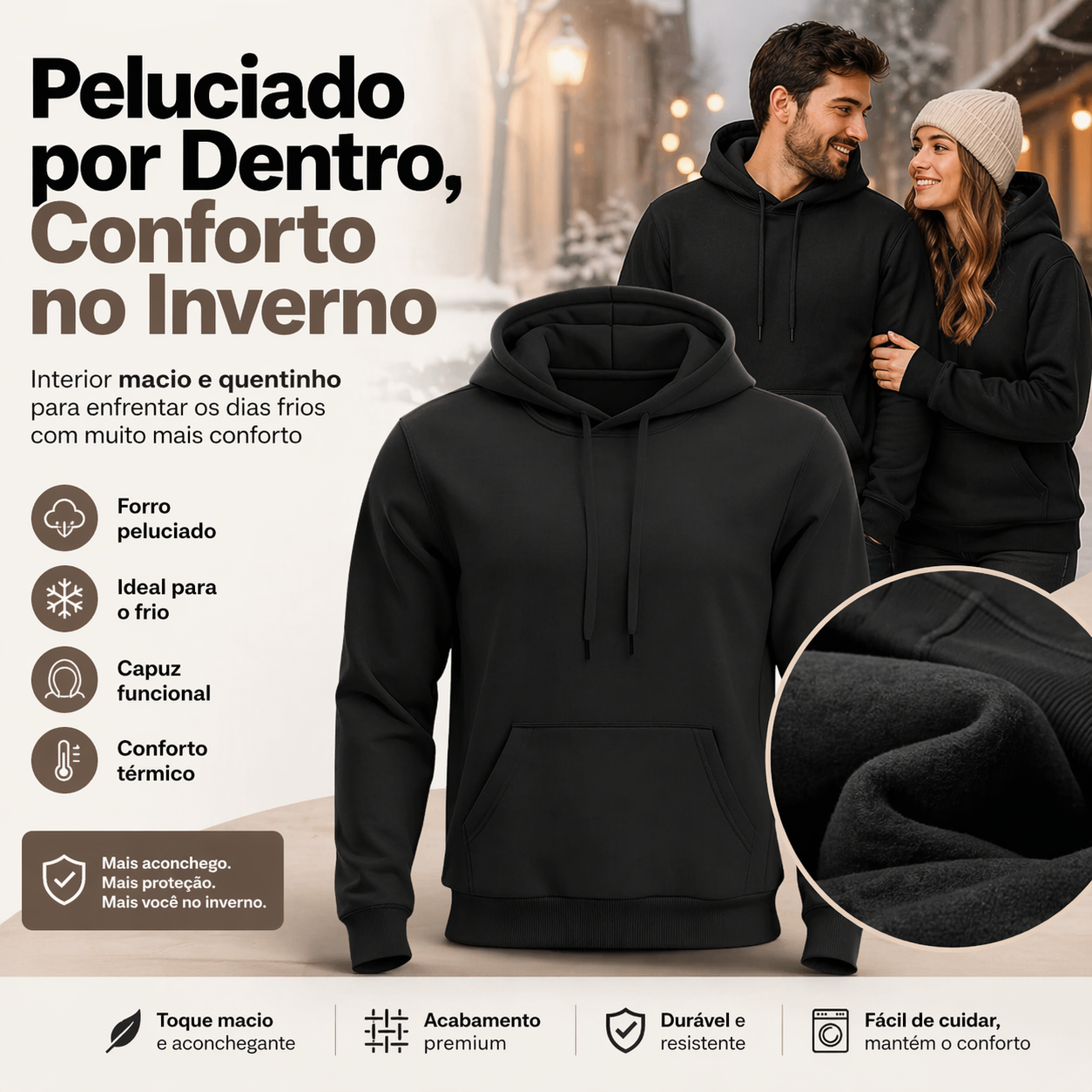 ✔️ Peluciado por Dentro: Interior macio e grosso, projetado para te manter 100% aquecido mesmo nos dias mais gelados.