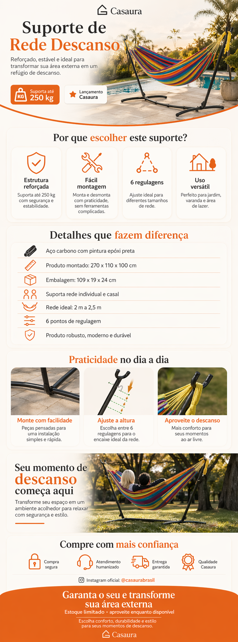 Relaxe com segurança e estilo usando nosso Suporte de Rede de Descanso de Metal da Casaura, projetado para suportar até 250kg. Este suporte robusto e durável é perfeito para qualquer ambiente, seja no jardim, varanda ou área de lazer. Fácil de montar e desmontar, ele oferece estabilidade máxima, permitindo que você aproveite sua rede de descanso sem preocupações. Transforme seu espaço em um refúgio de tranquilidade com este suporte de alta qualidade e design moderno!